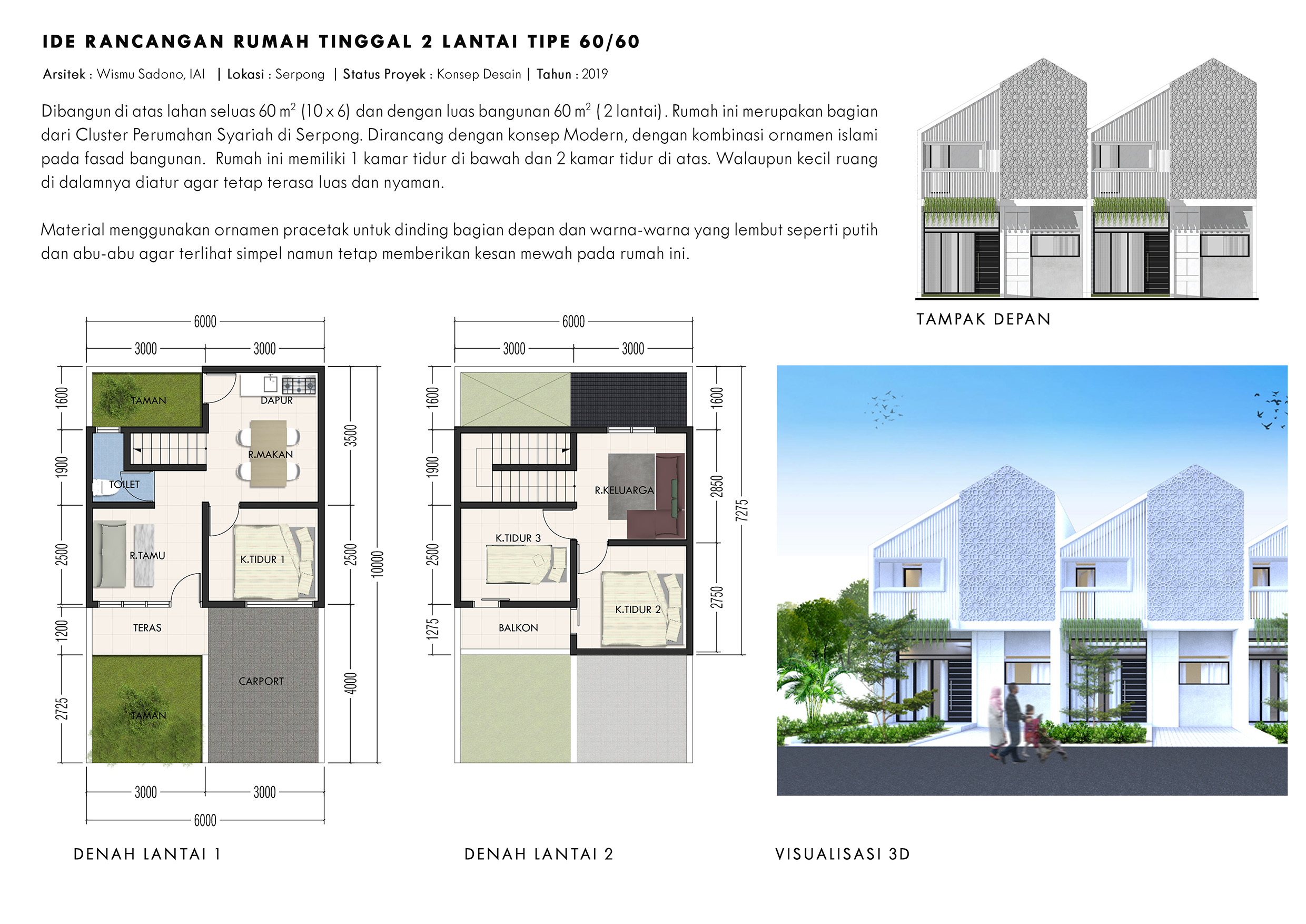 | 3 | Desain Rumah Tipe 60/60 | Rumah Tinggal 2 Lantai tipe 60/60, Dengan ruang-ruang di dalamnya meliputi : Lantai 1 : Carport untuk 1 Mobil, Ruang Tamu, 1 Kamar Tidur, Ruang Makan, Dapur dan 1 Kamar Mandi Lantai 2 : 1 Kamar Tidur, 1 Kamar Mandi, Ruang Keluarga dan Balkon Material : Ornamen GRC Custom & Besi Hollow Luas Tanah : 60 m2 Luas Bangunan : 60 m2 | OUTPUT RAB | ![]() ======================= |